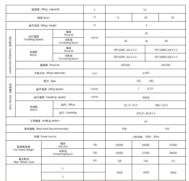 2、適用起重量5-10噸,適用跨度12-30米,工作環(huán)境-20℃-+40℃內(nèi)。